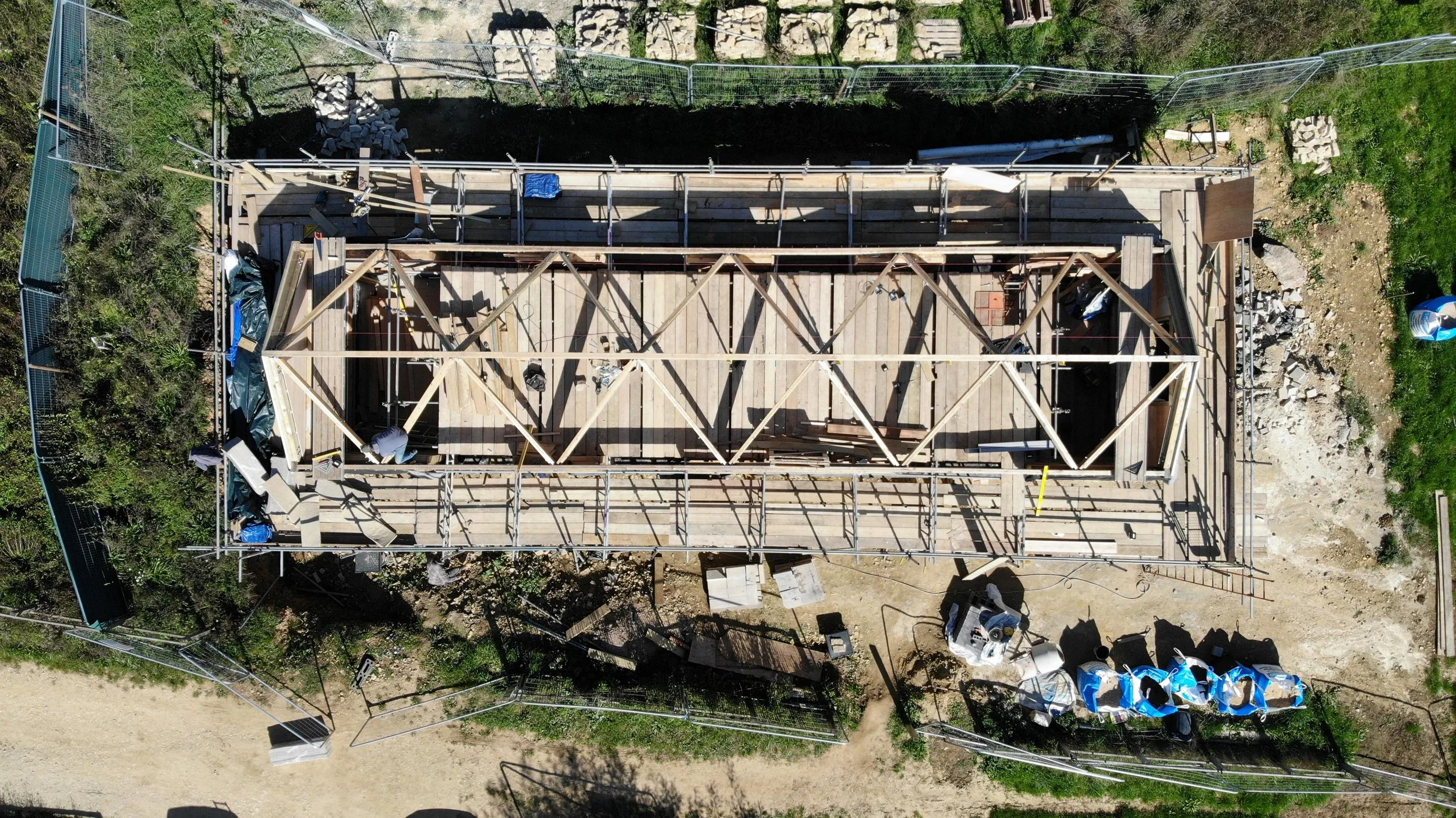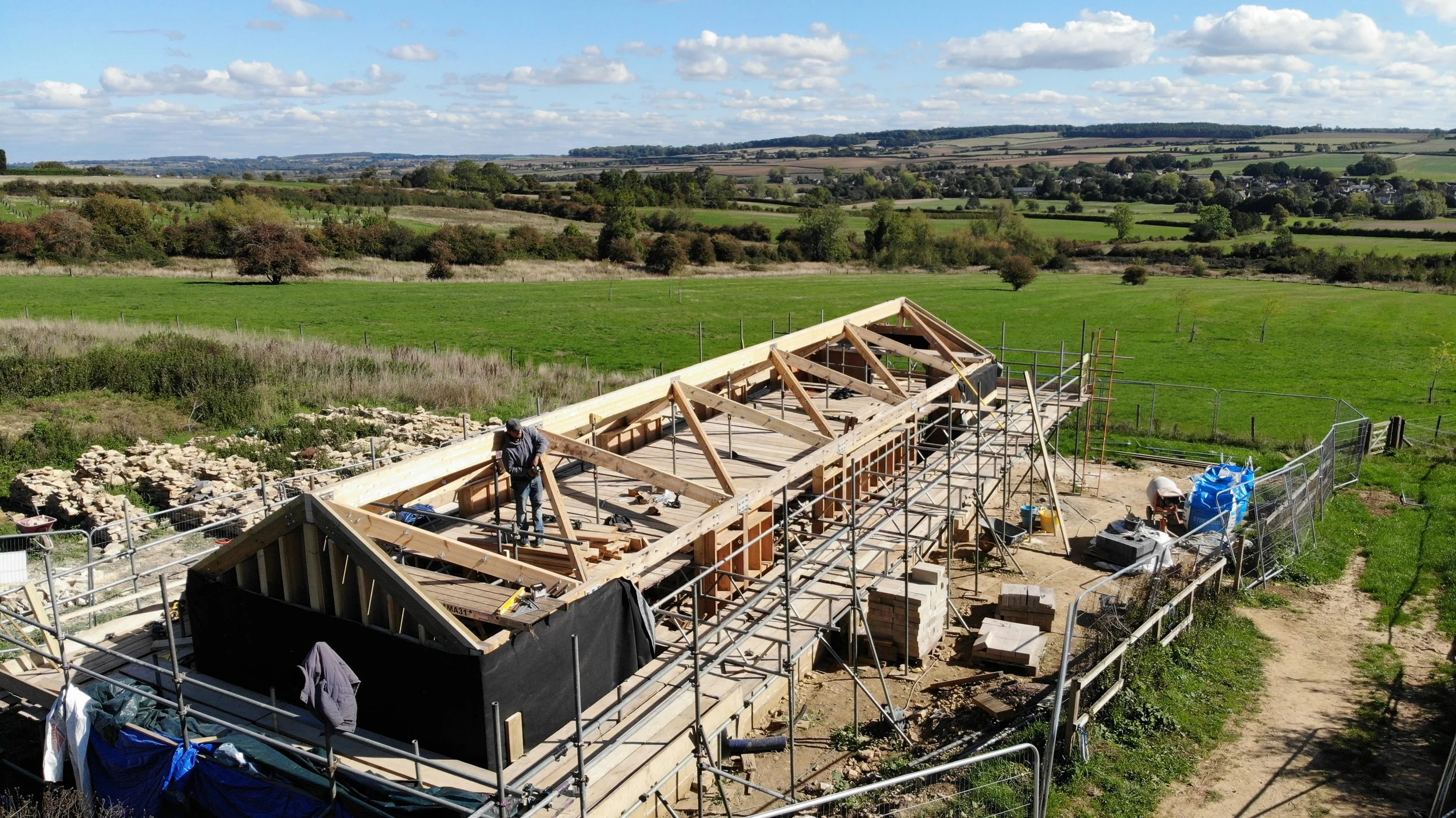 The ridge beam is comprised of two large sections of GluLam, spliced together to act as one. All of the timbers are sourced from local suppliers to limit the embodied carbon in transportation. The external leaf stonework is reclaimed from the original barns, travelling less than ten metres to its new home.
