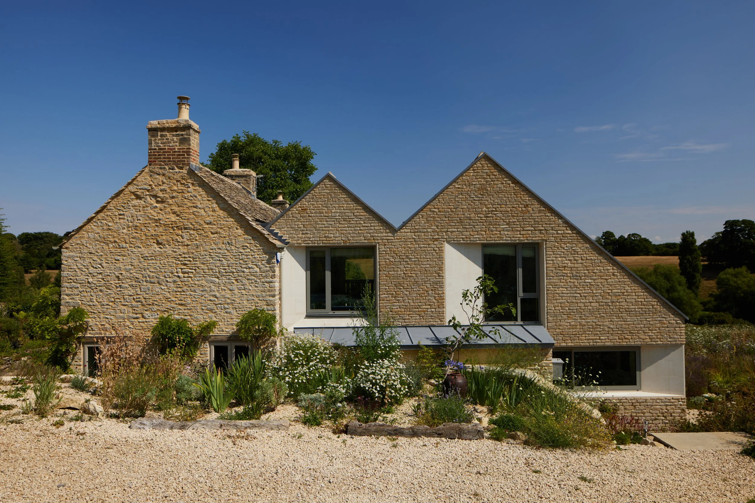 The completed extension is contemporary in style yet hints at the original building’s heritage with traditional Cotswold stone used as the primary material. Walls are constructed from a combination of rubble and cut ashlar stone. The rubble stone stands proud from the mortar to add shadows and texture beside the smooth, faceted ashlar.