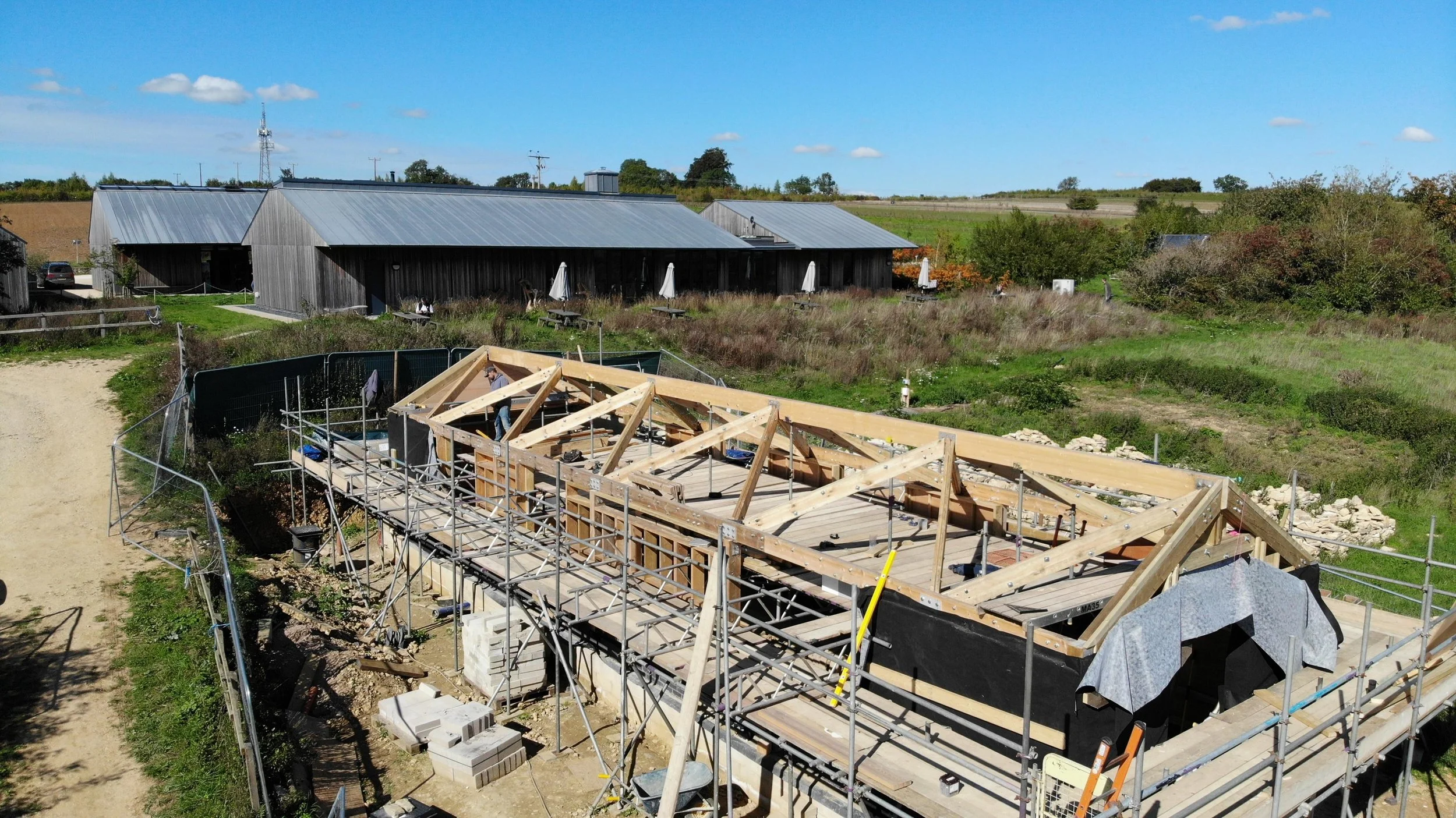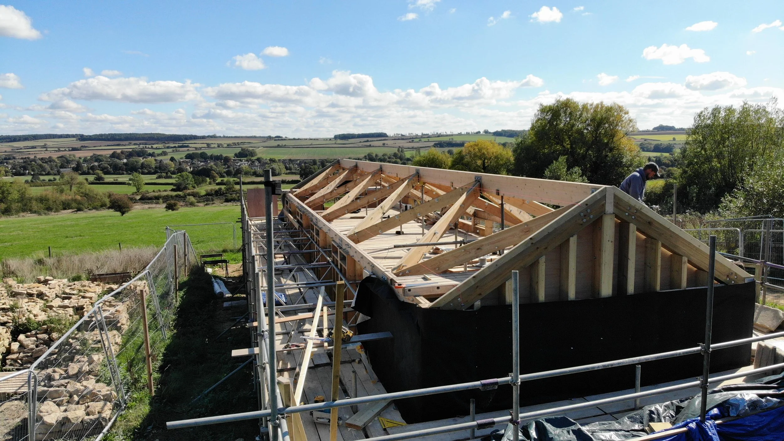 The ridge beam is comprised of two large sections of glulam, spliced together to act as one. All of the timbers are sourced from local suppliers to limit the embodied carbon in transportation. The external leaf stonework is reclaimed from the original barns, travelling less than ten metres to its new home!